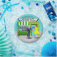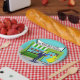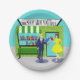 Attention, all bookworms! This Retro Book Lovers Paper Plate is the design for you. This 1960's style, minimalist art, cartoon drawing features a quaint Mum and Pop bookstore. It's the kind of shop with a helpful staff--where browsing is encouraged and shelves are stocked with everything from current bestsellers to obscure first editions. The green, stone building looks as if it has always been a part of the town's landscape. It has a green and white awning over an aqua window filled with colourful books just waiting to transport readers to other times and places. Step through the aqua door to find your next adventure. A bright, green bench on the front walk offers the perfect spot for "taking a load off." The sign above the store says, "The Shop Around The Corner." Today, on the front walk, it looks as if love is just around the corner for a couple of unsuspecting bibliophiles. We see a fair haired man in a navy suit and red necktie with his nose in a bright, blue book. Walking in the opposite direction, we see a brunette woman in a lemon, yellow dress. She is entranced in her own red-bound page turner. Perhaps they each need to use their black framed glasses to watch where they are going. If this were a romantic comedy, this would be their meet-cute. If we stick around, we are sure the witness the opening passages to this future couple's "happily ever after."