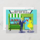 Attention, all bookworms! This Retro Book Lovers Postcard is the design for you. This 1960's style, minimalist art, cartoon drawing features a quaint Mum and Pop bookstore. It's the kind of shop with a helpful staff--where browsing is encouraged and shelves are stocked with everything from current bestsellers to obscure first editions. The green, stone building looks as if it has always been a part of the town's landscape. It has a green and white awning over an aqua window filled with colourful books just waiting to transport readers to other times and places. Step through the aqua door to find your next adventure. A bright, green bench on the front walk offers the perfect spot for "taking a load off." The sign above the store says, "The Shop Around The Corner." Today, on the front walk, it looks as if love is just around the corner for a couple of unsuspecting bibliophiles. We see a fair haired man in a navy suit and red necktie with his nose in a bright, blue book. Walking in the opposite direction, we see a brunette woman in a lemon, yellow dress. She is entranced in her own red-bound page turner. Perhaps they each need to use their black framed glasses to watch where they are going. If this were a romantic comedy, this would be their meet-cute. If we stick around, we are sure the witness the opening passages to this future couple's "happily ever after."