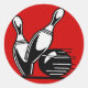 Retro bowling design shows bowling ball hitting the pins. Black and white on red.