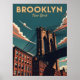 A stylised vintage illustration of the Brooklyn Bridge and Manhattan skyline at sunset with warm orange and teal colours.