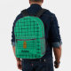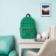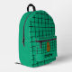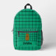 Adorable back pack featuring a cute happy cartoon brown potato. The background is a cute retro pattern of a black grid over a solid bold teal colour. A template at the bottom of the potato to add your name.