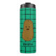 Adorable thermal tumbler featuring a cute happy cartoon brown potato. The background is a cute retro pattern of a black grid over a solid bold teal colour. A template at the bottom and left to the potato to add your name.