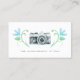 A photography business card featuring a retro camera at its focal point, surrounded by two delicately painted blue watercolor flowers, creating a visual masterpiece that reflects your artistic flair.