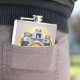 The flask itself is fine. It’s a cheap flask, obviously bought in bulk, however am prepared to overlook that. Given that it is a personalized item, I would have liked to have seen gift boxing instead of the generic packaging. Terrible printing, and/or quality. It’s a cheap, tacky vinyl. It is not cut straight and is also applied in a way that it is overhanging the bottom, causing the glue to catch on items and it will eventually roll and tear, damaging the wrap.