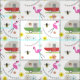 Pattern with illustrations of red and green vintage campers, flamingos, bees, bunting and floral designs.