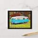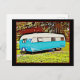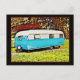 Old time old-time RV. The retro caravan is bright blue and white. It's surrounded with vivid green grass and a small forest is the backdrop. This photo art is pure nostalgia.