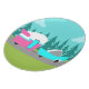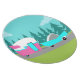 This Retro Camper / Trailer and Car Melamine Plate features a mid century modern, minimalist cartoon drawing that will leave you ready to take to the open road. An homage to the 1950s, this design features a vintage turquoise car with white top, pulling a kitschy travel trailer to its final destination. The perfectly restored, retro RV has a hot pink lower half, white top half, and a turquoise lightning bolt separating the two. The door in the side of the camper is also turquoise. The final accent is the hot pink wing protruding from the back of this home on wheels. The happy campers are motoring down a grey road. The roadway is surrounded by lush, green grass. In the background, we can see the teal silhouettes of a veritable forest of cedar trees, against an aqua sky with puffy, light blue clouds. This design is perfect for everyone from retired hippies, fledgling hipsters, or anyone who wants to relive some great childhood memories. The best part is that no one is asking, "Are we there yet?"
