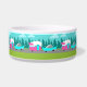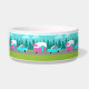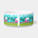 This Retro Camper / Trailer and Car Ceramic Pet Bowl features a mid century modern, minimalist cartoon drawing that will leave you ready to take to the open road. An homage to the 1950s, this design features a vintage turquoise car with white top, pulling a kitschy travel trailer to its final destination. The perfectly restored, retro RV has a hot pink lower half, white top half, and a turquoise lightning bolt separating the two. The door in the side of the camper is also turquoise. The final accent is the hot pink wing protruding from the back of this home on wheels. The happy campers are motoring down a grey road. The roadway is surrounded by lush, green grass. In the background, we can see the teal silhouettes of a veritable forest of cedar trees, against an aqua sky with puffy, light blue clouds. This design is perfect for everyone from retired hippies, fledgling hipsters, or anyone who wants to relive some great childhood memories. The best part is that no one is asking, "Are we there yet?"