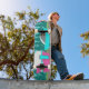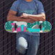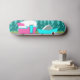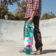 This Retro Camper / Trailer and Car Skateboard features a mid century modern, minimalist cartoon drawing that will leave you ready to take to the open road. An homage to the 1950s, this design features a vintage turquoise car with white top, pulling a kitschy travel trailer to its final destination. The perfectly restored, retro RV has a hot pink lower half, white top half, and a turquoise lightning bolt separating the two. The door in the side of the camper is also turquoise. The final accent is the hot pink wing protruding from the back of this home on wheels. The happy campers are motoring down a grey road. The roadway is surrounded by lush, green grass. In the background, we can see the teal silhouettes of a veritable forest of cedar trees, against an aqua sky with puffy, light blue clouds. This design is perfect for everyone from retired hippies, fledgling hipsters, or anyone who wants to relive some great childhood memories. The best part is that no one is asking, "Are we there yet?"