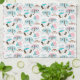 A super cute pattern with a camping theme featuring retro caravans, tents, deck chairs, sun umbrellas and picnic tables in tones of turquoise blue, pink and white,