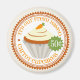 A magnet featuring a retro advertisement inspired design consisting of an illustration of a carrot cupcake with cream cheese icing topped with a small carrot. Cupcake is inside decorative orange circle with text "Try Our Fresh Baked Carrot Cupcakes" and "50¢"