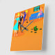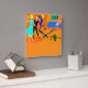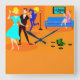 This Retro Cartoon Cocktail Party Wall Clock doesn't have an introverted bone in its body! The mid century modern design features a vibrant cartoon drawing of a living room and a lively cocktail party. There is an attractive couple on the dance floor. The blonde woman in a turquoise dress and her tall, dark and handsome escort are dancing the cha-cha. On the floor, there is a green record player surrounded by vinyl records. Against the far wall, a beautiful redhead is sitting on a blue sofa. She is wearing a bright pink dress. Her only accessory is the martini glass in her hand. To her side is a floor lamp minus the shade. Hmm… Where is the shade? It's on the head of a tipsy man in a blue suit who is clearly the life of the party. He's also holding a martini glass. Whoever decorated the room wasn't afraid of colour. It has an orange brick wall and an orange floor. On the wall behind the sofa, there is a teal and turquoise painting of a globe with a black frame.