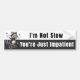 Turn the tables on road bullies with our bold and cheeky car bumper sticker that declares: "I'm Not Slow, You're Just Impatient". Empower yourself against inconsiderate drivers. Let them know that you're not intimidated by their antics. Stick on your car, truck or SUV and drive with confidence, knowing that you are taking charge of the conversation.