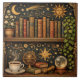 A cozy retro-inspired design featuring a charming celestial bookshelf filled with vintage books, delicate botanical accents, cosmic design elements and a comforting cup of tea or coffee.