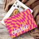 Playing cards featuring a hot pink and orange, twisted chequerboard pattern and your name in a white, retro style font.