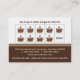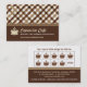 A chequered pattern in shades of brown, cream and mahogany give a retro feel to this customer loyalty business card great for any coffee business. The pattern makes up the top part of the business card on the front with a rich brown panel below displaying a graphic coffee cup next to the name of the business, a tagline or description and a website or other text. The reverse shows a grid of coffee icons to stamp for a customer to receive a free or discounted coffee or other beverage. Contact information goes in the brown panel below. Great customer loyalty reward card for a coffee bar, restaurant, coffee shop or diner. Available with matching products.