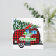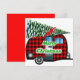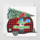 This adorable retro Christmas card has a red plaid cartoon camper hauling a xmas tree and the words Merry Christmas in green.