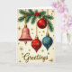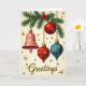 On the card, you’ll see a lovely illustration that feels like a cozy holiday hug. It’s filled with green pine branches, red berries, and four special ornaments hanging from golden chains. Everything sits on a calm, creamy background with twinkling golden starbursts, like a gentle snowfall. The colors are soft and pretty: a pink bell with golden stripes, two deep red baubles, and a bright teal-blue teardrop, all with fancy gold designs. In the middle, the word "Greetings" is written in fancy cursive, adding a personal touch. This card is perfect for spreading holiday cheer with its classic charm and elegant design. 🎅🏼🎄🎁