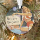 Christmas ornament featuring a vintage 1950s illustration of a pretty pinup girl in a santa outfit holding a sign. Customise the back with your own sentiment. Retro cool!