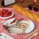 Paper plates with a cute retro style illustration. Santa Claus with a bushy white beard wearing his traditional red suit.