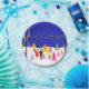 This Retro Christmas Tree Farm Paper Plate features a mid century modern, minimalist, cartoon family in search of the perfect tree for trimming. The design shows Mum, Dad and Junior in a colourful, 1960s style, Christmas tree lot that looks like it belongs in a televised holiday special. They were beckoned there by the glowing, yellow spotlights illuminating the evening sky and the strands of colourful Christmas lights, which are strung from pole to pole. The snow covered lot offers trees of the cartoon variety. Don't expect to find a blue spruce here. But, if the family is wanting a pink, purple, yellow, orange or red tree, they are in luck! Hey, there are even a couple of green cedars, if they choose to go a more traditional route. The snow is continuing to fall on the merry family decked out in their holiday attire. Junior is wearing blue dungarees and a shirt that is redder than a certain reindeer's nose. Dad is wearing a black suit with a bright green tie. But it is Mum who puts the jolly is this family's wardrobe. She is wearing a red dress with green trim and a matching Santa hat. Mum and Dad are still conferring, unaware that Junior is making a mad dash to the hot pink tree of his dreams. Check every side, Junior! It wouldn't do to purchase a tree with bald spots. Wouldn't you just know it? The tree is as perfect as this design. In fact, if this design were any more perfect, you would hear a choir of children singing in the background.