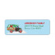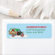 A retro style red and green Christmas truck carries a red ribbon wrapped Holiday tree and ploughs into a white snowdrift on this cute return address label. The brightly coloured truck and tree are placed on a medium blue background. Your custom text is in red and green at the right. Cute for your Holiday correspondence!