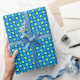 Large dots with a contrasting border, based on a classic, Mid-Century Modern upholstery pattern - pale green dots bordered in dark navy blue on a rich, cerulean blue background
