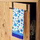 Polka dots and circles large and small in light and dark blues in a cute retro pattern on a kitchen towel with blue borders.