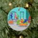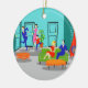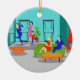 This customisable Retro Classic Television Ceramic Christmas Ornament takes you back to a simpler time. The 1960's style, minimalist, cartoon drawing will have you looking for the opening credits. The design shows a mid century modern, sunken, living room with teal and turquoise walls and a red, cone shaped fireplace, complete with a roaring fire. All eyes are on the lanky, man of the house as he makes his grand entrance. The handsome Mister is wearing a blue suit and orange tie. His lovely Mrs. and energetic, young son are rushing to greet him. The lady of the house is wearing a hot pink, sheath dress, which she fills out in all the right places. The flip in her dark hair is sheer perfection. Junior is wearing a red shirt and blue jeans for his dash to see if his father has brought him anything. Whoa! Don't knock over the potted plant, Junior! On the lower level, we can see a green couch and an orange coffee table. Wait! We appear to have guests! Seated on the couch are a dark haired man in a blue suit and red tie, alongside a shapely blonde woman in a red dress with a red bow in her hair. Hey! It's Dad's coworkers. How did they get there first? It's one of the eternal mysteries of television. It looks like we're all set for a great evening in sitcom suburbia. But, first, we have to see if Dad is going to trip over the orange ottoman or sidestep it with some fancy footwork. Oh, the zaniness! The only thing missing from this scene is the theme song. And, if you listen closely, you can probably hear it in your mind. The opposite side of this holiday ornament has plenty of room for personalising.