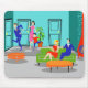 This Retro Classic Television Mousepad takes you back to a simpler time. The 1960's style, minimalist, cartoon drawing will have you looking for the opening credits. The design shows a mid century modern, sunken, living room with teal and turquoise walls and a red, cone shaped fireplace, complete with a roaring fire. All eyes are on the lanky, man of the house as he makes his grand entrance. The handsome Mister is wearing a blue suit and orange tie. His lovely Mrs. and energetic, young son are rushing to greet him. The lady of the house is wearing a hot pink, sheath dress, which she fills out in all the right places. The flip in her dark hair is sheer perfection. Junior is wearing a red shirt and blue jeans for his dash to see if his father has brought him anything. Whoa! Don't knock over the potted plant, Junior! On the lower level, we can see a green couch and an orange coffee table. Wait! We appear to have guests! Seated on the couch are a dark haired man in a blue suit and red tie, alongside a shapely blonde woman in a red dress with a red bow in her hair. Hey! It's Dad's coworkers. How did they get there first? It's one of the eternal mysteries of television. It looks like we're all set for a great evening in sitcom suburbia. But, first, we have to see if Dad is going to trip over the orange ottoman or sidestep it with some fancy footwork. Oh, the zaniness! The only thing missing from this scene is the theme song. And, if you listen closely, you can probably hear it in your mind.