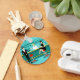 Every hour is happy hour with this Retro Cocktail Lounge Button Keychain. The mid century modern design features a vibrant, 1960's style, minimalist, cartoon drawing of a classy, cocktail bar. Against the backdrop of an aqua wall, we can see rows of drink glasses. At least we can see the teal silhouettes of drink glasses. Judging from the shapes of the stemware, this bar is well equipped to wet your whistle, whatever your drink preference. A most competent and personable bartender is manning the teal bar with yellow accents. The young barkeep is wearing a pristine, white shirt with black bow tie. His fresh-faced good looks, blonde hair and black hipster glasses give us every reason to believe that he either spends his days as a struggling actor or a superhero. In one hand, the handsome mixologist is handing a martini to a customer on the opposite side of the bar. The waiting customer is a broad-shouldered gentleman in a black suit and red tie. He's the sort of fellow who is described as tall, dark, and handsome even when it's still hours until closing time. There seems to be a red and chrome bar stool with Mr. Debonair's name on it. Yet, not to be presumptuous, he asks the question, "Pardon me. Is this seat taken?" He is asking the raven haired gal on the neighbouring bar stool. She's a real "girl next door" type, if you happen to live next door to a flawless beauty with a figure that won't quit. She is wearing a black dress and holding a martini in one hand. She's hoping that she and the approaching gentleman have more in common that their drink preference and choice of wardrobe colour. It looks like this evening just got interesting. Cheers to you!