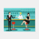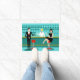 Every hour is happy hour with this Retro Cocktail Lounge Door Mat. The mid century modern design features a vibrant, 1960's style, minimalist, cartoon drawing of a classy, cocktail bar. Against the backdrop of an aqua wall, we can see rows of drink glasses. At least we can see the teal silhouettes of drink glasses. Judging from the shapes of the stemware, this bar is well equipped to wet your whistle, whatever your drink preference. A most competent and personable bartender is manning the teal bar with yellow accents. The young barkeep is wearing a pristine, white shirt with black bow tie. His fresh-faced good looks, blonde hair and black hipster glasses give us every reason to believe that he either spends his days as a struggling actor or a superhero. In one hand, the handsome mixologist is handing a martini to a customer on the opposite side of the bar. The waiting customer is a broad-shouldered gentleman in a black suit and red tie. He's the sort of fellow who is described as tall, dark, and handsome even when it's still hours until closing time. There seems to be a red and chrome bar stool with Mr. Debonair's name on it. Yet, not to be presumptuous, he asks the question, "Pardon me. Is this seat taken?" He is asking the raven haired gal on the neighbouring bar stool. She's a real "girl next door" type, if you happen to live next door to a flawless beauty with a figure that won't quit. She is wearing a black dress and holding a martini in one hand. She's hoping that she and the approaching gentleman have more in common that their drink preference and choice of wardrobe colour. It looks like this evening just got interesting. Cheers to you!