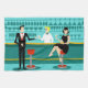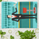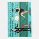 Every hour is happy hour with this Retro Cocktail Lounge Kitchen Towel. The mid century modern design features a vibrant, 1960's style, minimalist, cartoon drawing of a classy, cocktail bar. Against the backdrop of an aqua wall, we can see rows of drink glasses. At least we can see the teal silhouettes of drink glasses. Judging from the shapes of the stemware, this bar is well equipped to wet your whistle, whatever your drink preference. A most competent and personable bartender is manning the teal bar with yellow accents. The young barkeep is wearing a pristine, white shirt with black bow tie. His fresh-faced good looks, blonde hair and black hipster glasses give us every reason to believe that he either spends his days as a struggling actor or a superhero. In one hand, the handsome mixologist is handing a martini to a customer on the opposite side of the bar. The waiting customer is a broad-shouldered gentleman in a black suit and red tie. He's the sort of fellow who is described as tall, dark, and handsome even when it's still hours until closing time. There seems to be a red and chrome bar stool with Mr. Debonair's name on it. Yet, not to be presumptuous, he asks the question, "Pardon me. Is this seat taken?" He is asking the raven haired gal on the neighbouring bar stool. She's a real "girl next door" type, if you happen to live next door to a flawless beauty with a figure that won't quit. She is wearing a black dress and holding a martini in one hand. She's hoping that she and the approaching gentleman have more in common that their drink preference and choice of wardrobe colour. It looks like this evening just got interesting. Cheers to you!