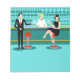 Every hour is happy hour with this Retro Cocktail Lounge Notepad. The mid century modern design features a vibrant, 1960's style, minimalist, cartoon drawing of a classy, cocktail bar. Against the backdrop of an aqua wall, we can see rows of drink glasses. At least we can see the teal silhouettes of drink glasses. Judging from the shapes of the stemware, this bar is well equipped to wet your whistle, whatever your drink preference. A most competent and personable bartender is manning the teal bar with yellow accents. The young barkeep is wearing a pristine, white shirt with black bow tie. His fresh-faced good looks, blonde hair and black hipster glasses give us every reason to believe that he either spends his days as a struggling actor or a superhero. In one hand, the handsome mixologist is handing a martini to a customer on the opposite side of the bar. The waiting customer is a broad-shouldered gentleman in a black suit and red tie. He's the sort of fellow who is described as tall, dark, and handsome even when it's still hours until closing time. There seems to be a red and chrome bar stool with Mr. Debonair's name on it. Yet, not to be presumptuous, he asks the question, "Pardon me. Is this seat taken?" He is asking the raven haired gal on the neighbouring bar stool. She's a real "girl next door" type, if you happen to live next door to a flawless beauty with a figure that won't quit. She is wearing a black dress and holding a martini in one hand. She's hoping that she and the approaching gentleman have more in common that their drink preference and choice of wardrobe colour. It looks like this evening just got interesting. Cheers to you!