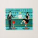 Every hour is happy hour with this Retro Cocktail Lounge Puzzle. The mid century modern design features a vibrant, 1960's style, minimalist, cartoon drawing of a classy, cocktail bar. Against the backdrop of an aqua wall, we can see rows of drink glasses. At least we can see the teal silhouettes of drink glasses. Judging from the shapes of the stemware, this bar is well equipped to wet your whistle, whatever your drink preference. A most competent and personable bartender is manning the teal bar with yellow accents. The young barkeep is wearing a pristine, white shirt with black bow tie. His fresh-faced good looks, blonde hair and black hipster glasses give us every reason to believe that he either spends his days as a struggling actor or a superhero. In one hand, the handsome mixologist is handing a martini to a customer on the opposite side of the bar. The waiting customer is a broad-shouldered gentleman in a black suit and red tie. He's the sort of fellow who is described as tall, dark, and handsome even when it's still hours until closing time. There seems to be a red and chrome bar stool with Mr. Debonair's name on it. Yet, not to be presumptuous, he asks the question, "Pardon me. Is this seat taken?" He is asking the raven haired gal on the neighbouring bar stool. She's a real "girl next door" type, if you happen to live next door to a flawless beauty with a figure that won't quit. She is wearing a black dress and holding a martini in one hand. She's hoping that she and the approaching gentleman have more in common that their drink preference and choice of wardrobe colour. It looks like this evening just got interesting. Cheers to you!