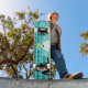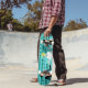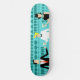 Every hour is happy hour with this Retro Cocktail Lounge Skateboard. The mid century modern design features a vibrant, 1960's style, minimalist, cartoon drawing of a classy, cocktail bar. Against the backdrop of an aqua wall, we can see rows of drink glasses. At least we can see the teal silhouettes of drink glasses. Judging from the shapes of the stemware, this bar is well equipped to wet your whistle, whatever your drink preference. A most competent and personable bartender is manning the teal bar with yellow accents. The young barkeep is wearing a pristine, white shirt with black bow tie. His fresh-faced good looks, blonde hair and black hipster glasses give us every reason to believe that he either spends his days as a struggling actor or a superhero. In one hand, the handsome mixologist is handing a martini to a customer on the opposite side of the bar. The waiting customer is a broad-shouldered gentleman in a black suit and red tie. He's the sort of fellow who is described as tall, dark, and handsome even when it's still hours until closing time. There seems to be a red and chrome bar stool with Mr. Debonair's name on it. Yet, not to be presumptuous, he asks the question, "Pardon me. Is this seat taken?" He is asking the raven haired gal on the neighbouring bar stool. She's a real "girl next door" type, if you happen to live next door to a flawless beauty with a figure that won't quit. She is wearing a black dress and holding a martini in one hand. She's hoping that she and the approaching gentleman have more in common that their drink preference and choice of wardrobe colour. It looks like this evening just got interesting. Cheers to you!