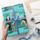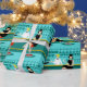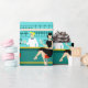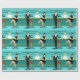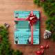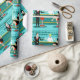 Every hour is happy hour with this Retro Cocktail Lounge Wrapping Paper. The mid century modern design features a vibrant, 1960's style, minimalist, cartoon drawing of a classy, cocktail bar. Against the backdrop of an aqua wall, we can see rows of drink glasses. At least we can see the teal silhouettes of drink glasses. Judging from the shapes of the stemware, this bar is well equipped to wet your whistle, whatever your drink preference. A most competent and personable bartender is manning the teal bar with yellow accents. The young barkeep is wearing a pristine, white shirt with black bow tie. His fresh-faced good looks, blonde hair and black hipster glasses give us every reason to believe that he either spends his days as a struggling actor or a superhero. In one hand, the handsome mixologist is handing a martini to a customer on the opposite side of the bar. The waiting customer is a broad-shouldered gentleman in a black suit and red tie. He's the sort of fellow who is described as tall, dark, and handsome even when it's still hours until closing time. There seems to be a red and chrome bar stool with Mr. Debonair's name on it. Yet, not to be presumptuous, he asks the question, "Pardon me. Is this seat taken?" He is asking the raven haired gal on the neighbouring bar stool. She's a real "girl next door" type, if you happen to live next door to a flawless beauty with a figure that won't quit. She is wearing a black dress and holding a martini in one hand. She's hoping that she and the approaching gentleman have more in common that their drink preference and choice of wardrobe colour. It looks like this evening just got interesting. Cheers to you!