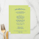 A colourful retro funky modern bright wedding dinner menu. Which features chic template design of boho vintage pale green background and blue typography and hand written menu in blue . And bright back green background. Perfect and matching with the whole suite.