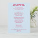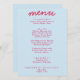 A colourful retro funky modern bright wedding dinner menu. Which features chic template design of boho vintage sky blue background and red magenta typography and hand written menu in red. Perfect and matching with the whole suite.