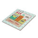 A kitchen tile featuring an illustration of a retro inspired kitchen decorated with a red, turquoise, orange, and yellow colour scheme. Personalise with your name in red. Background is light blue with zig zags.
