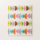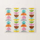 Feather your nest with this Retro Colourful Nests Puzzle! The design features a cream background with gold speckles and rows of wonderfully kitschy, colourful semi-circles resting on minimalistic, black branches. The semi-circles resemble fairy tale, bird's nests in shades of light blue, teal, turquoise, orange, pink, yellow, green, grey, and brown. The orange nests have a fun brick pattern and the brown nests feature a cartoon wood grain. The nest filled trees alternate between right-side up and upside down, which means this whimsical design even looks perfect when standing on your head. This pattern is reminiscent of a vintage mid century modern design. You're sure to enjoy our homage to the 1950s. Buy this today and be the coolest cat on your block.