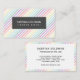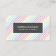 Elegant business cards for any kind of business like interior designer, colour consultant, image consulant, textile, upholsterer, furniture refinisher or other business featuring a striped rainbow pattern in pink, purple, light green, sage, yellow and coral and your name and title on the front in refined typography in trendy white colour over a dark grey label.