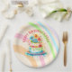 Whimsical floral birthday cake in blue, orange and pink with a retro orange, pink and purple background. Add a name in the personalise area.