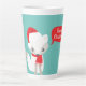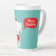 Whimsical white fox with retro red scarf, santa hat and Merry Christmas text bubble on aqua background.