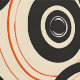 This artwork features a striking pattern of concentric circles in varying sizes, arranged across a neutral cream background. The design incorporates bold black and vibrant orange hues, creating a strong visual contrast that immediately captures attention. The circles are layered and interconnected, with some lines appearing hand-drawn, adding a dynamic and slightly irregular feel to the composition. The repetition of circular forms and the retro colour scheme evoke a sense of mid-century modern design, giving the piece a timeless yet playful quality.