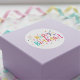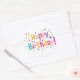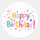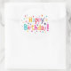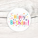 This design features a "Happy Birthday!" greeting in a fun, nostalgic style using a variety of bright colours. The lettering is surrounded by a playful scattering of colourful dots and stars that give it a classic, old-school party look. The bright teal, pink, orange, and purple shapes stand out clearly against the plain white background. It has a simple, festive feel that reminds you of childhood celebrations and tossed confetti. These circular labels are a quick way to add a pop of colour and a cheerful message to any card or gift bag.