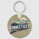 Round keychain features a scenic retro styled state silhouette of Connecticut on faux tan burlap background. Personalise with name or message on back.