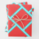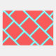 Retro coral read and Turquoise colour combination for three different geometric patterns wrapping paper featuring bricks, dots and diamond shaped mesh pattern.