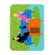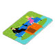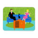 This Retro Couple with Cat Flexible Magnet features a cartoon couple trying to get cosy while watching television on a mid century modern, blue sofa. The cat, however, has other ideas. On one side of the sofa, there is a handsome man in a black suit with red tie. On the other side of the stylish couch, there is a beautiful, blonde woman in a form fitting, hot pink dress. Things would be going great if it weren't for the sleek black cat, which has laid claim to the centre sofa cushion. This 1960's style, minimalist art design is set in a stylish living room. The sofa's backdrop is a green, stone wall. On the aqua floor, there is a round, green shag rug, which matches the stone wall. At the forefront of the design, we see the back of an orange television set with rabbit ears, which seems to be playing the cat's favourite TV program.