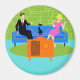 This Retro Couple with Cat Magnet features a cartoon couple trying to get cosy while watching television on a mid century modern, blue sofa. The cat, however, has other ideas. On one side of the sofa, there is a handsome man in a black suit with red tie. On the other side of the stylish couch, there is a beautiful, blonde woman in a form fitting, hot pink dress. Things would be going great if it weren't for the sleek black cat, which has laid claim to the centre sofa cushion. This 1960's style, minimalist art design is set in a stylish living room. The sofa's backdrop is a green, stone wall. On the aqua floor, there is a round, green shag rug, which matches the stone wall. At the forefront of the design, we see the back of an orange television set with rabbit ears, which seems to be playing the cat's favourite TV program.